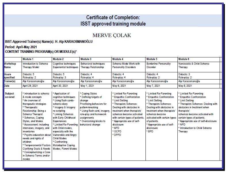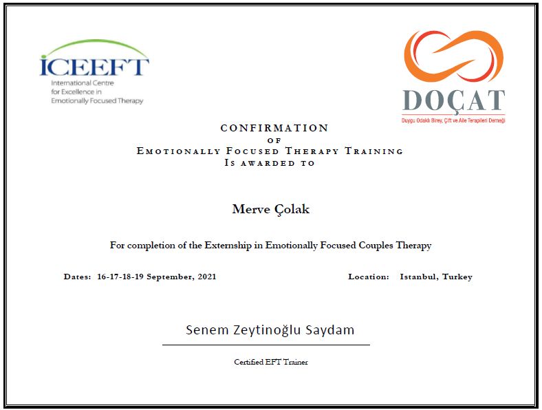 Mesleki çalışmalarımı Bilişsel Davranışçı Terapi (BDT), Şema Terapi, 2. Düzey EMDR Terapisi ve Duygu Odaklı Çift Terapisi yaklaşımları çerçevesinde sürdürmekteyim.